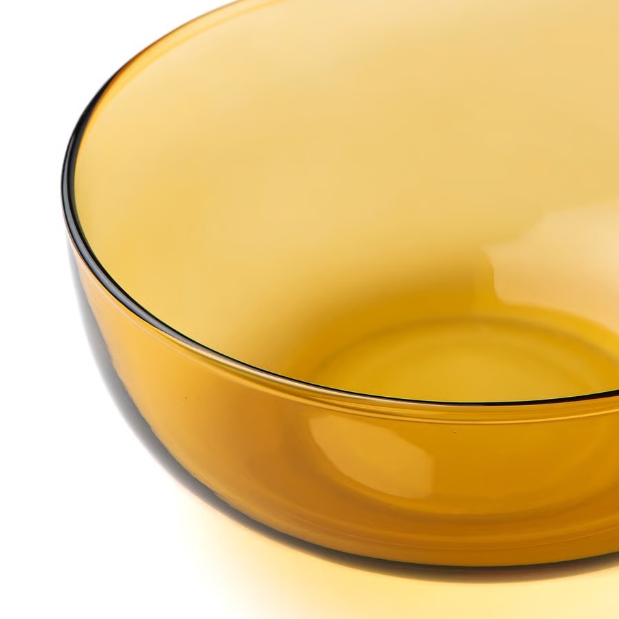 Стеклянная миска с тёплым жёлтым оттенком оживляет интерьер и становится ярким акцентом на столе. Свет, проходящий через поверхность, создаёт мягкое сияние, подчёркивая естественные цвета фруктов, салатов или других угощений, и добавляет композиции лёгкости и свежести.
