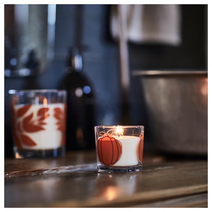 Свеча HOSTAGILLE с ароматом пряной тыквы от IKEA создаёт в доме уютную атмосферу осеннего праздника. Её аромат сочетает в себе ноты тыквы, пряностей и выпечки, наполняя пространство теплом и комфортом.