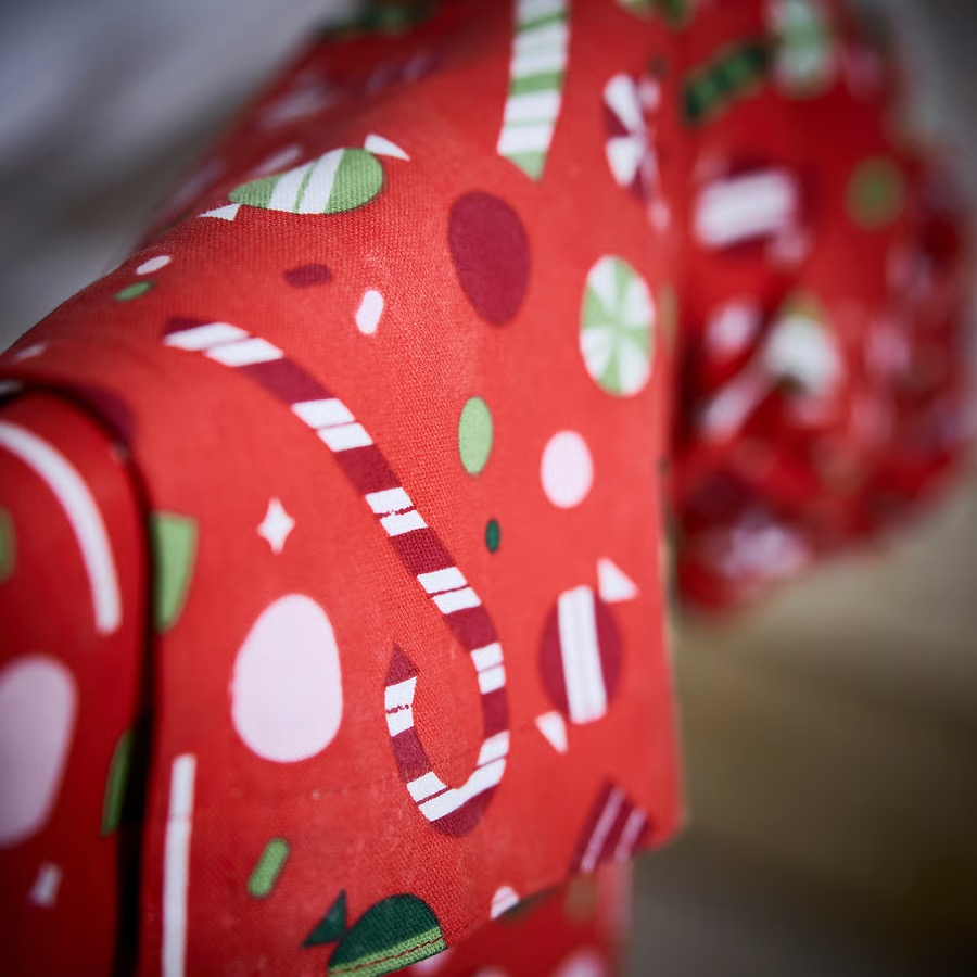 Детский фартук ярко‑красного цвета с праздничным рисунком в виде конфеток и сладостей. Он изготовлен из 100 % хлопка, комфортный в использовании и простой в уходе.
